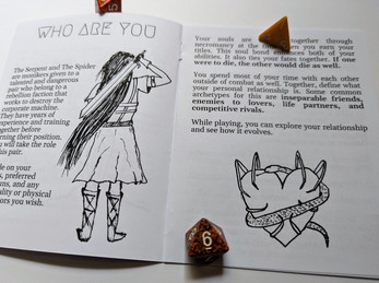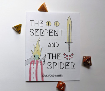 The Serpent and The Spider is a tiny ttrpg for 2 players. One player takes the role of The Serpent, a charismatic sword-wielder. The other player takes the role of The Spider, a highly intelligent necromancer. Your souls are bonded together. You will fight against corrupt corporations and explore your relationship.